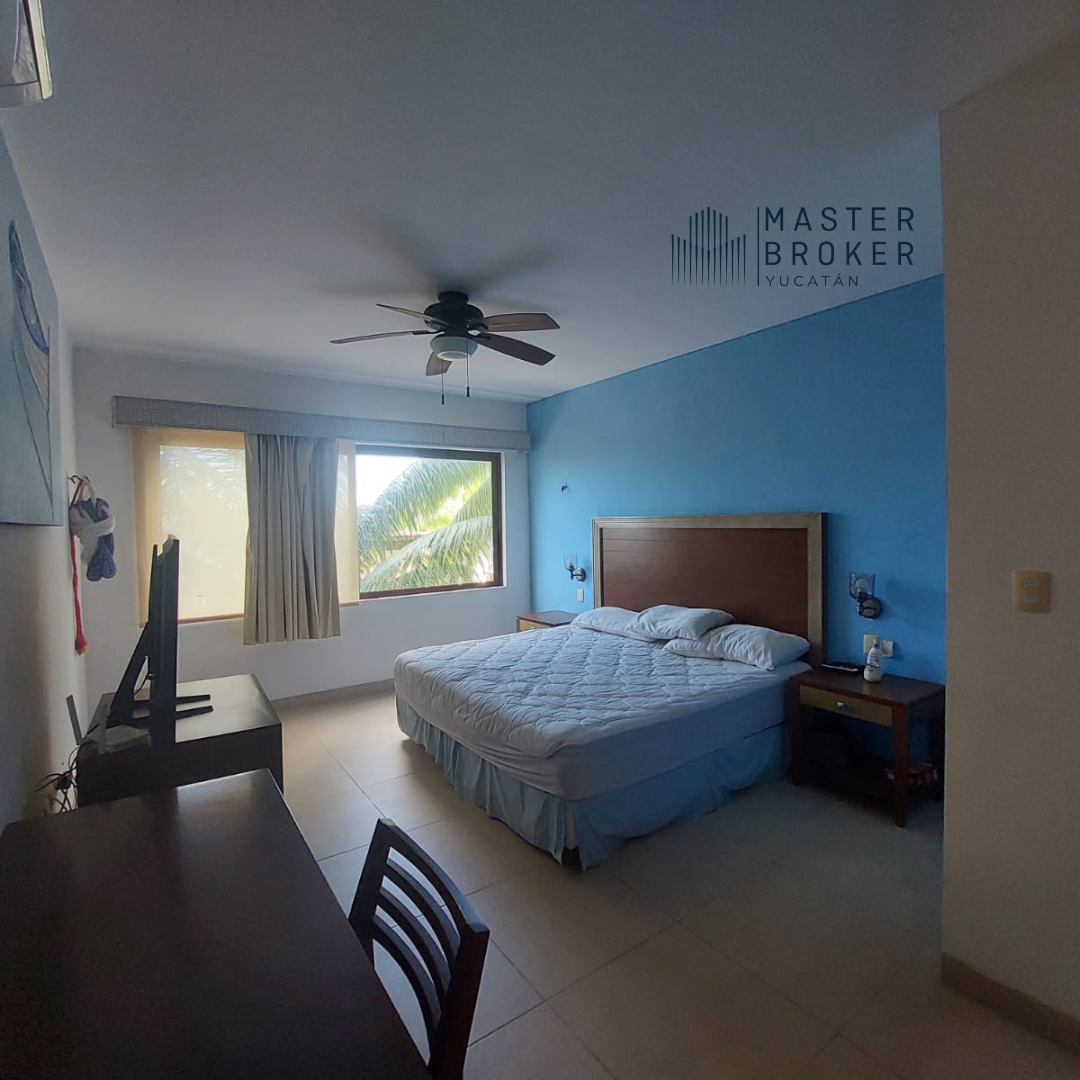1 Recamara principal con cama king size, closet vestidor, baño con doble lavabo y tocador con espejo, tv, mesa de trabajo, ventilador, mini split y cortinas, hamaca, ventana con vista al mar.