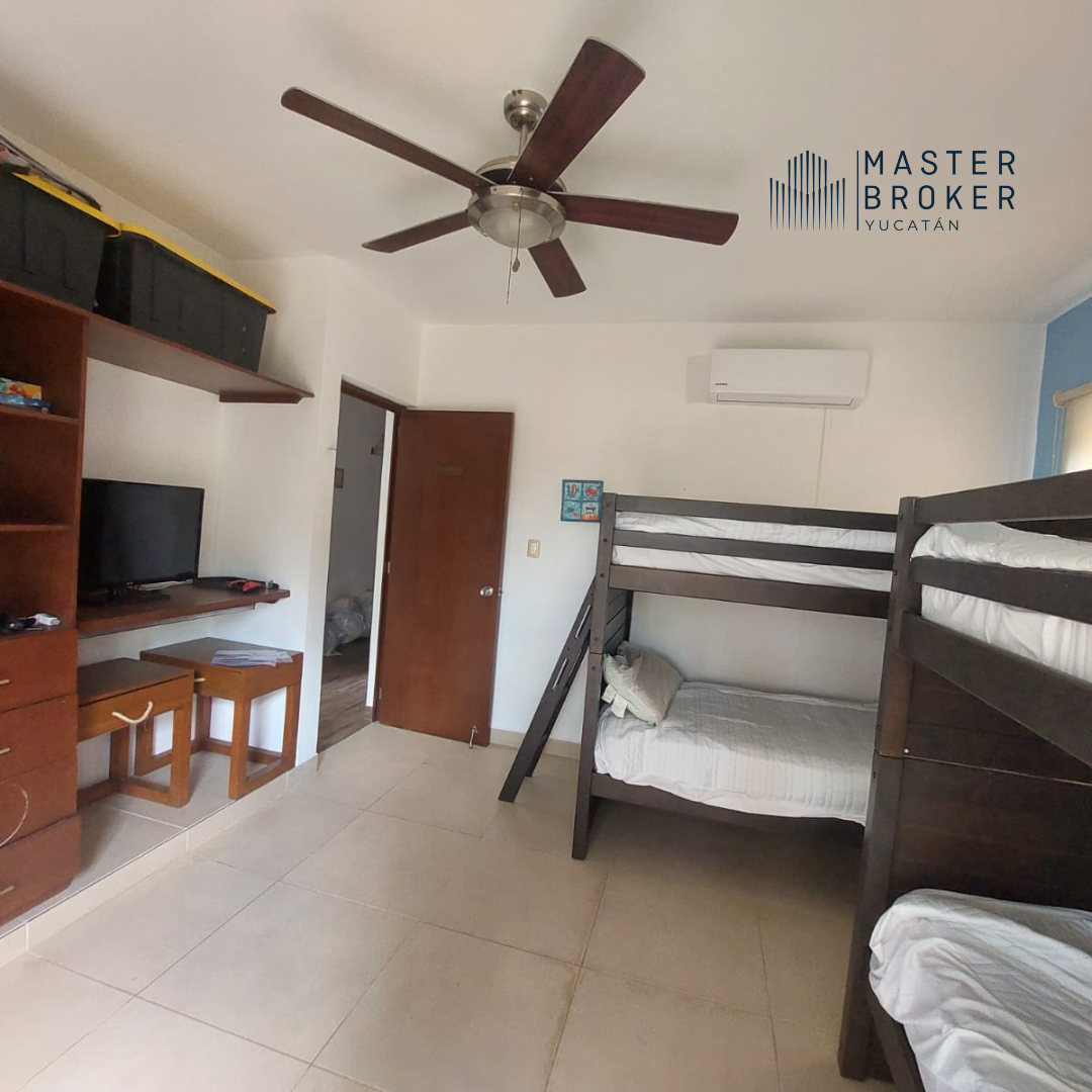 1 Recámara secundaria con 2 literas (4 camas individuales) closet, mesa de trabajo, tv, ventilador, mini split, baño completo equipado y balcón.
